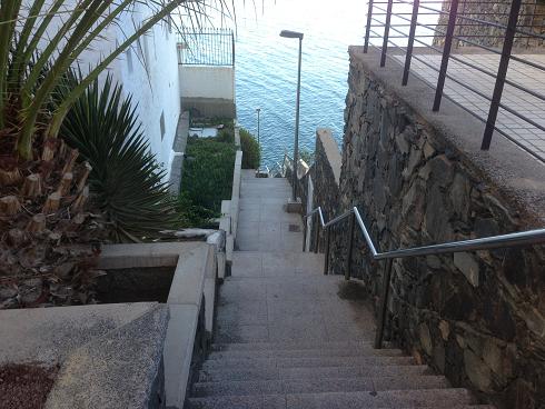 Marianne gick själv. Underbar morgon på en tom strand… Många trappsteg ner och