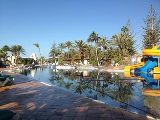 | När vi kom från stranden tog vi ett dopp i poolen och la oss under en palm på solsängar och vilade. Bredvid oss la sig några norrmän som var trevliga. |